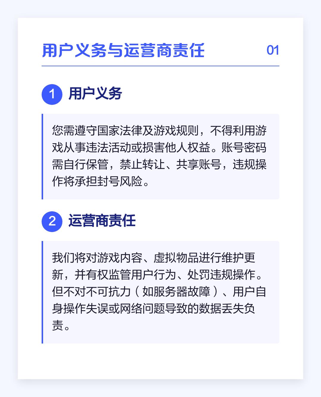 1.用户义务:您需遵守国家法律及游戏规则,不得利用游戏从事违法活动或损害他人权益。
